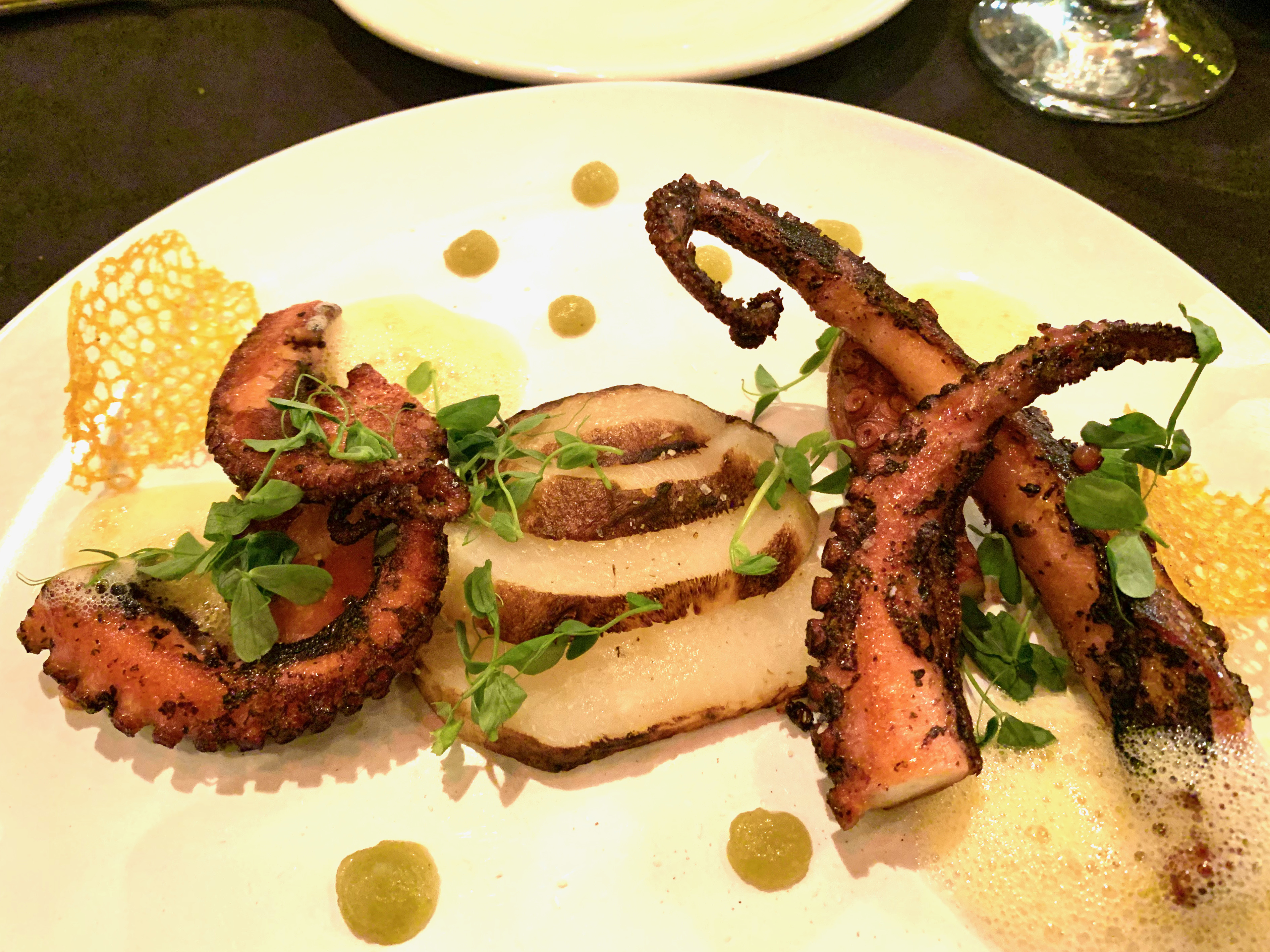 Appetizers might feature rabbit bresaola accented by pecorino and sumac, or finely chopped kohlrabi, seasoned so it almost tastes like spicy tuna. Main courses include the classic elegance of surf-and-turf (prime beef tenderloin matched with shrimp in a beurre-blanc emulsion) and the octopus, prepared sous-vide and then seared in chile oil and blood orange, creating a caramelized, almost candied effect.