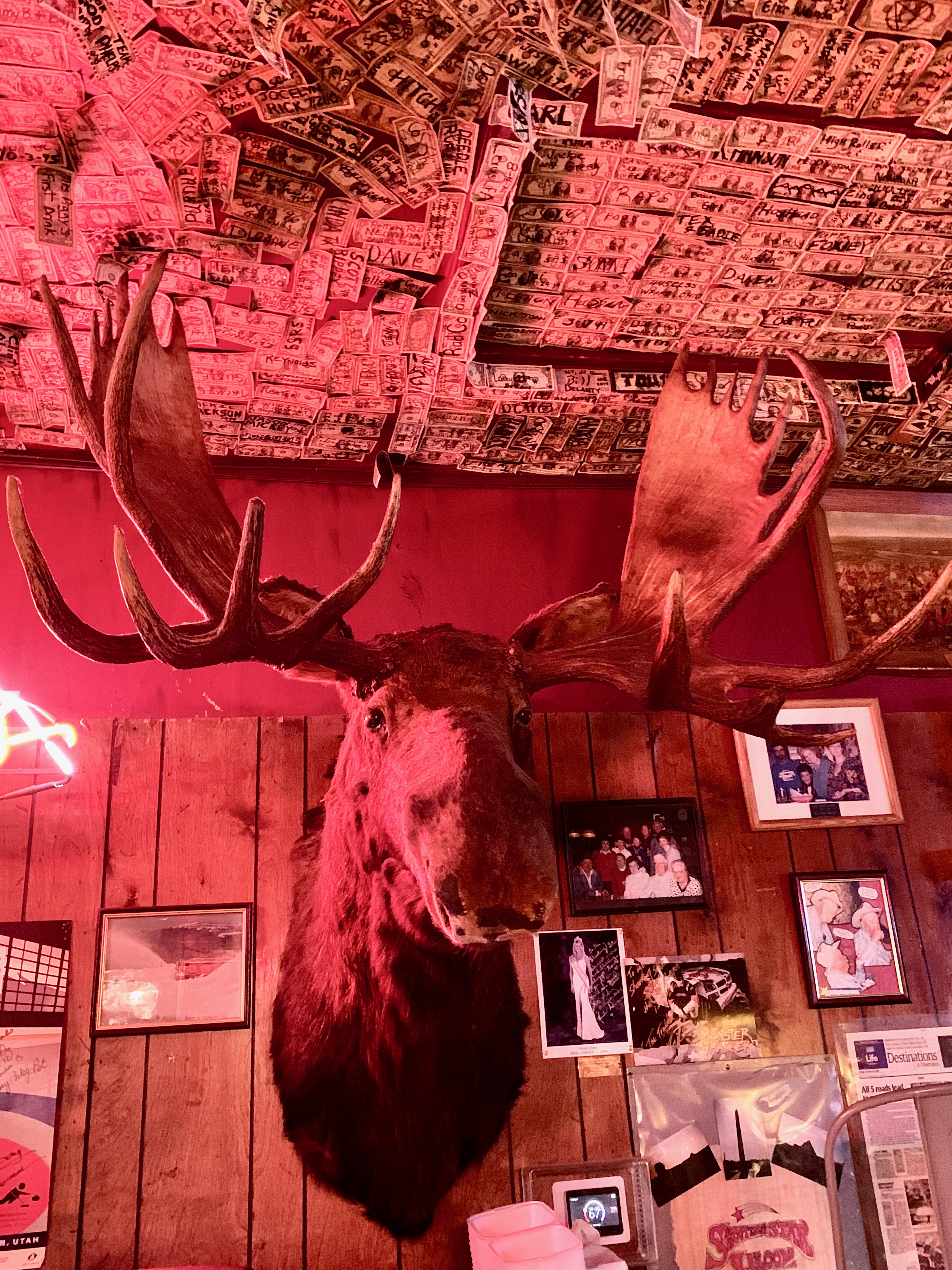 Shooting Star Saloon [Huntsville] First, some answers to five questions you don’t have yet. (1) Yes, it’s the oldest continuously operating saloon west of the Mississippi, established in 1879. (2) The taxidermed St. Bernard head on the wall memorializes Buck, beloved pet of a previous owner. (3) At recent count, the money that dangles from the ceiling totals more than $18,000. (4) And the largest denomination bill is $100.