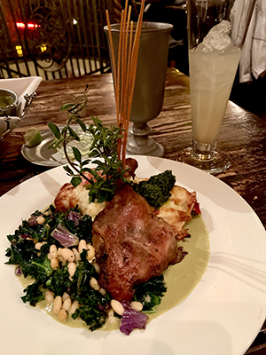 My go-to entrée is the duck enchilada, a medley of tortilla-swathed honey-roasted fowl plus a confit leg attaining verticality over white-bean relish, grilled onion and peppers. The buffalo flank steak spices things up with chile-spiked scalloped potatoes.